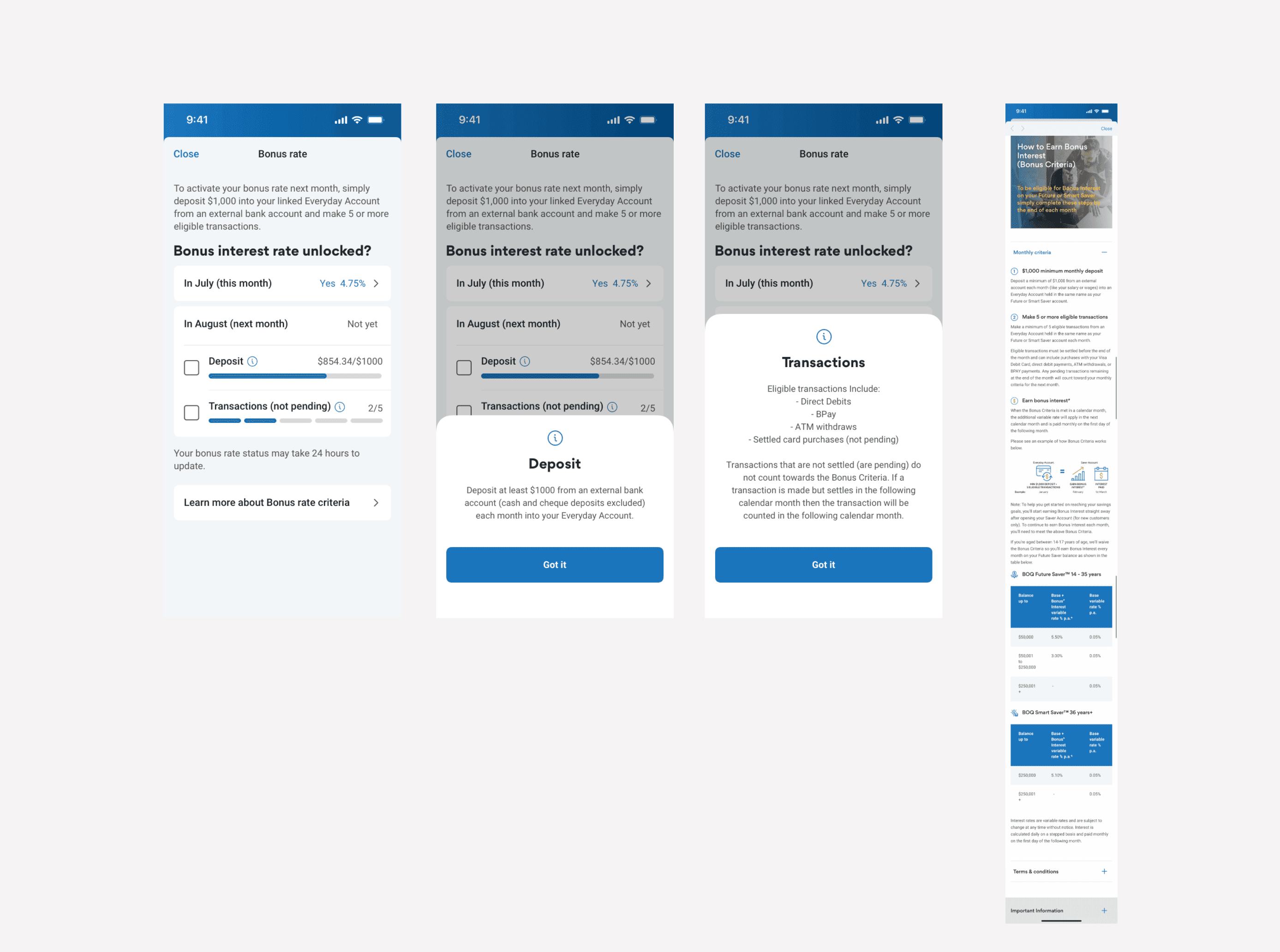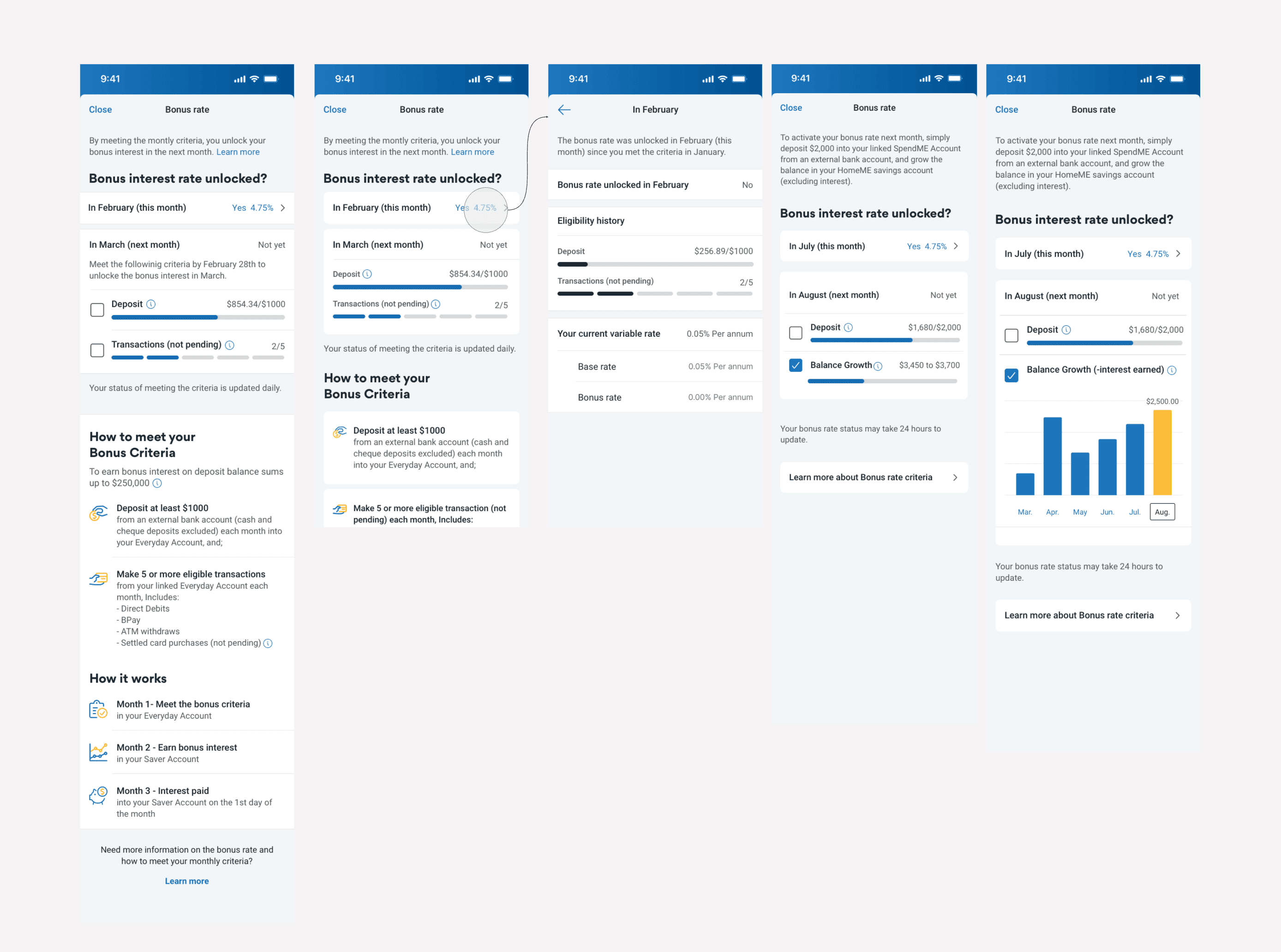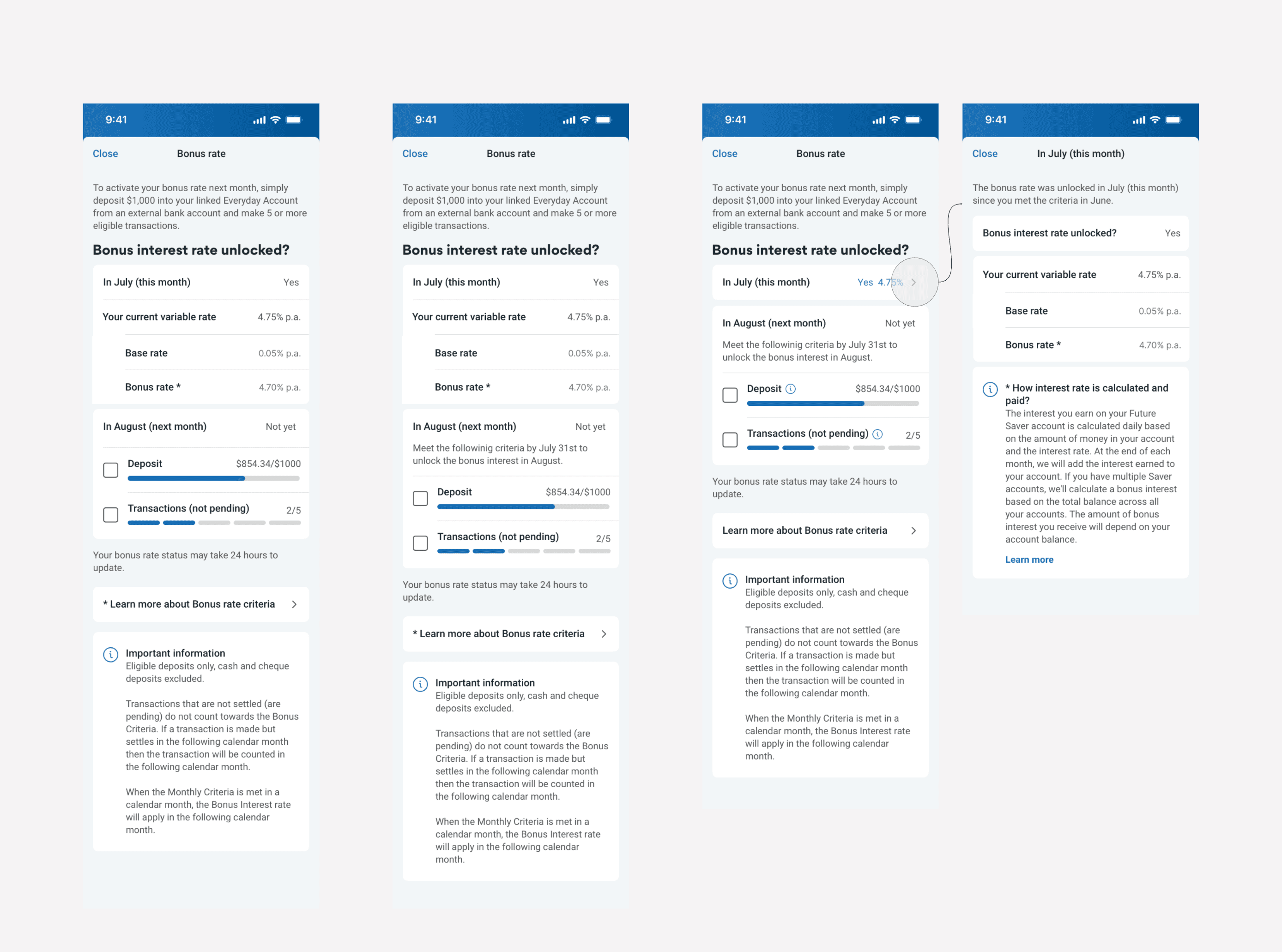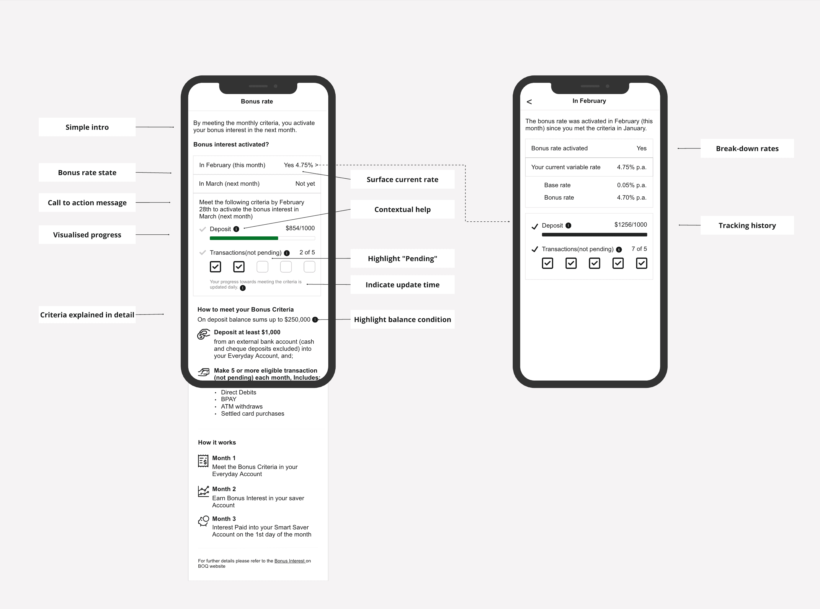 We mapped the product criteria and user journey to identify friction points in tracking bonus interest. By analysing app interactions, call centre logs, and user feedback, we uncovered transparency gaps that led to confusion and high support demand. These insights shaped our design hypothesis.