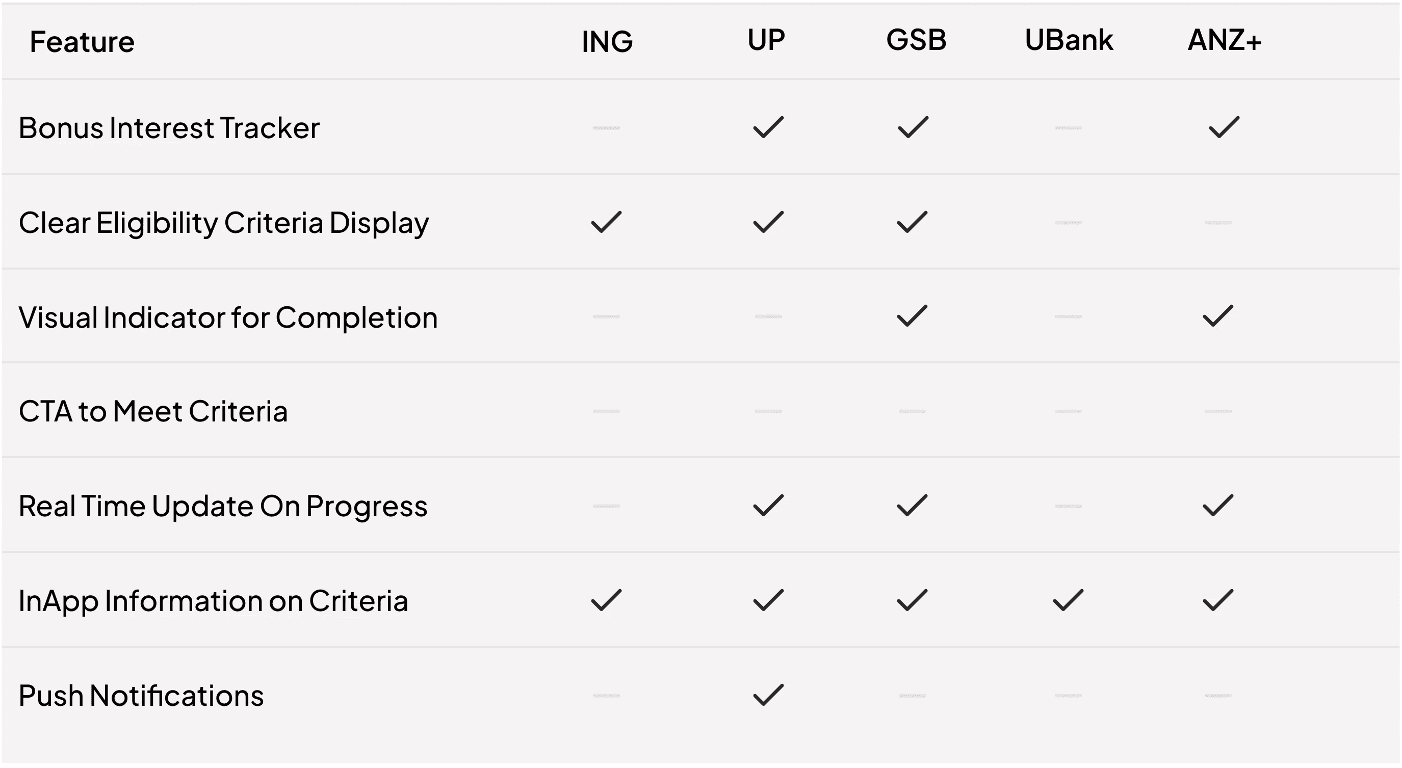 We audited 5 competitor banking apps to benchmark how the market handled bonus interest visibility. The gap was clear: most competitors either lacked a tracker entirely or buried eligibility criteria. That absence validated the opportunity, and the table below shows exactly where the market fell short.